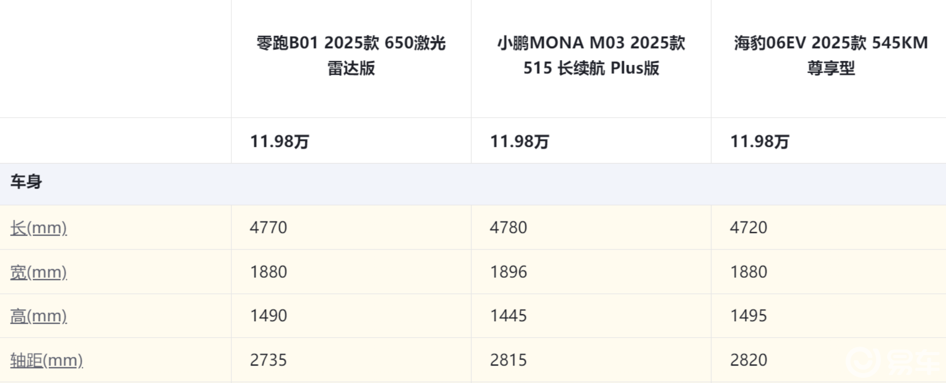 咱们选择的车型都卡在12万内,而这三款车型都有11.98万的版本,其中M03是2025款515长续航Plus版,海豹06EW是2025款545千米尊享型,零跑B01是2025款650激光雷达版。在价格完全一样的情况下,这三者的配置可以说是参差不齐,其中配置最低的自然是M03,B01的配置是最高的。在车轮制动方面,B01的规格最高,225 18寸轮胎,视觉效果以及实际的功能性都更好,海豹06EV只有17寸,而M03偏窄为215的宽度。在主动安全方面,海豹06EV比M03多出了前方交通穿行预警以及前方交通穿行制动还有道路交通标识识别,而B01在此基础之上还多了一个信号灯识别。而且由于零跑B01搭配了三辆车中仅有的激光雷达,所以它有高速路段和城市路段的导航辅助驾驶能力,甚至还有好用的记忆泊车功能。