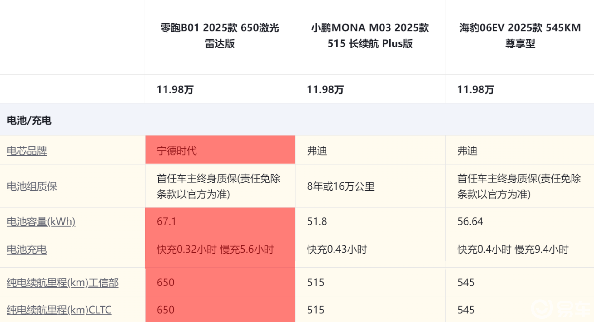 第二自然就是比谁更能跑。要是大过年的堵在高速上又赶上没电,那绝对不是一件体面的事。在电池容量上,M03又是垫底的,其电芯品牌来自弗迪,容量为51.8度,30%充到80%需要0.43小时,整体表现相对是比较平庸的。而比亚迪作为行业巨佬,在电力方面的技术自然是不遑多让的,为海豹06EV配备了一块容量为56.64度的磷酸铁锂刀片电池组,快充时间为0.4小时,确实在各个方面都要强于M03。而零跑B01这边显然要更下本一些,其电池组来自宁德时代,宁德时代的电池可是金字招牌,而且同样是安全的磷酸铁锂结构,只不过电池容量大了很多,达到了67.1度,比小鹏M03多了近15度,甚至比很多相对入门的插混车容量还要更大。也正因为此,其工信部纯电续航里程为650公里,比小鹏M03多出了135公里。更充足的电量除了有着更好的自由度,对于过年省内开车的朋友而言,一次充满电可以直接开到家里,省时省力。而且电池组的容量越大,意味着充电次数更少,一年算下来还是能够再省一笔。