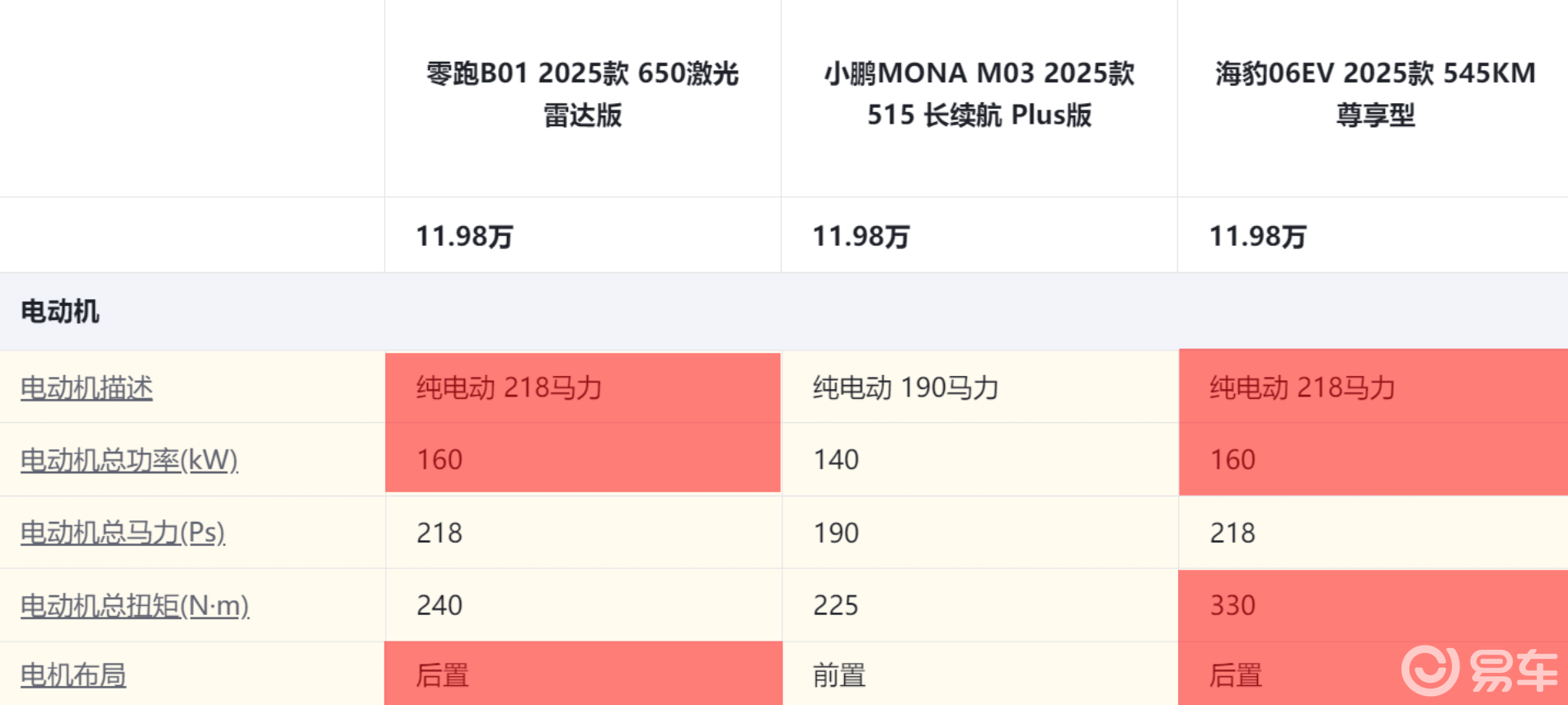 想要真正省钱,让所有车主都愿意去开车,那么三电系统就非常关键了。首先,动力方面比亚迪海豹06EV最占优,218马力330牛米的单电机有着最强的动力,M03垫底,190马力225牛米的单电机参数最弱,整备质量也是三者最重的,平心而论,这个动力水平够用肯定是够用的,但显然没有另外两者那么充沛自如。零跑B01居中,最大功率同为218马力,最大扭矩介于两者之间,240牛米,而且它和海豹06EV一样都是后驱结构,所以他们俩不但加速能力更好,甚至还有点驾驶乐趣可言,不是有句话叫做无后驱不豪华吗,现在的后驱车真的太多了。要知道一年两箱油的车主,一般都会选择轩逸卡罗拉或者朗逸这类前驱车,开上200多马力的后置后驱纯电车,那可真的能感受到百分之七八十宝马3系了。