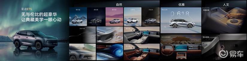 星途ET5的超豪华感知始于“一眼心动”。采用新奢设计的自然恒韵美学设计语言,汲取自然本色,5种外观色+2种内饰色为用户带来了更多样高级的车色选择;内饰采用中轴对称的东方设计,自带典雅贵气,营造视觉与身心的绝对平衡感。结合风的气势、玉的温润、贝的高贵、星的璀璨,星途ET5前脸标志性的“贝形大灯”与尾部由472颗LED灯珠组成的“星瀚灯带”,不仅拥有极高的辨识度,更仿佛在流动的光影中雕刻时间。