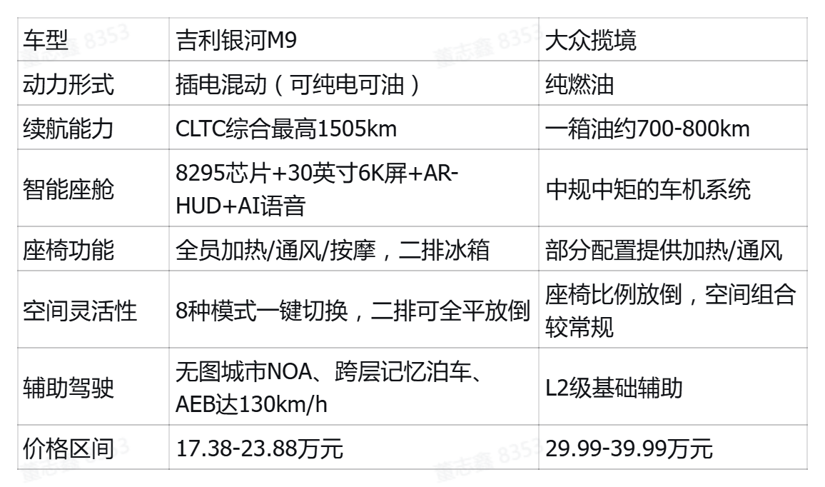 如果你追求极致空间、智能体验与用车经济性,且乐于尝试新能源车型,经常全家长途出游,需要车辆具备多场景适应能力,希望一辆车能覆盖日常通勤、周末露营、跨城探亲等多种用途,那么吉利银河M9无疑是目前市场上最符合你需求的“全家出游旗舰SUV”。它不仅空间大,更是“聪明、舒适、安全、节能”的全能选手。如果你更信任传统燃油车,偏好德系驾驶质感,对智能配置要求不高,更看重品牌与保值率,用车场景以城市和高速为主,不需要过多拓展功能,那么大众揽境仍然是一台可靠、实用、空间充足的家庭SUV,值得列入备选清单。