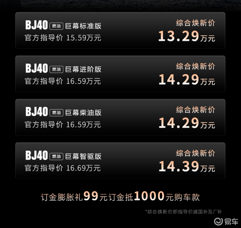 BJ40燃油巨幕版官方指导价15.59-16.69万元,综合焕新价低至13.29万元,同时拥有订金膨胀礼:1月27日下订,即可享受“99元订金抵1000元购车款”优惠政策。