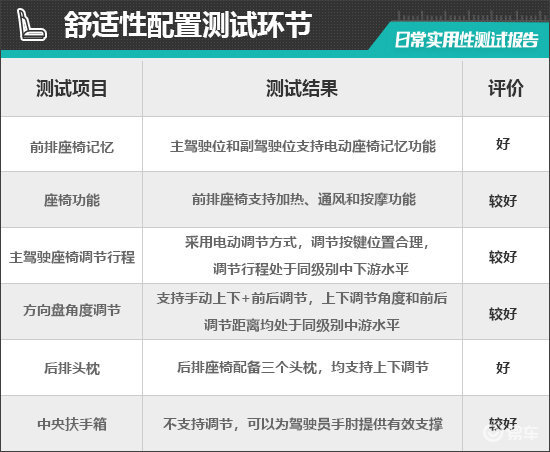 座椅方面,评测车主驾驶座椅电动调节按键位于座椅侧面,调节按键位置合理。此外,评测车前排座椅支持3档加热、通风功能,并具备按摩功能,舒适性配置表现不错。