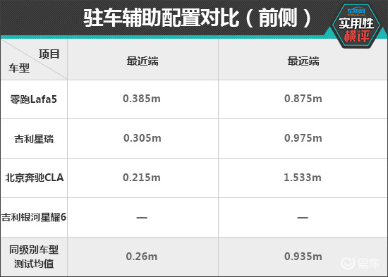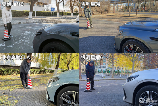 驻车辅助配置方面,在前驻车雷达测试中,由于银河星耀6未配备前雷达,所以未获得测试数据。奔驰CLA最远探测距离达到1.533m,雷达功率表现最优。在最近提示距离方面,吉利星瑞和奔驰CLA与同级别车型测试均值更为接近,表现好于零跑Lafa5。