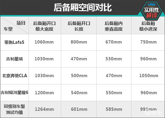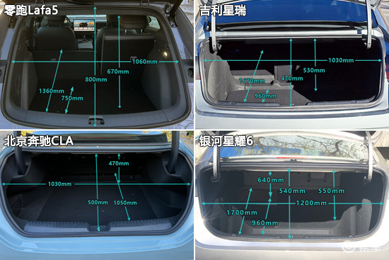 后备厢方面,四款车型的内部造型均较为规整。实测来看,零跑Lafa5整体表现较好,有两项数值超过了同级别车型测试均值。相比之下,吉利星瑞和银河星耀6所有测试数值均未达到同级别车型测试均值,存在提升空间。