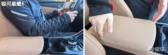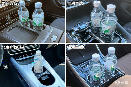 杯架测试环节,四款车型的杯架数量均为4个。其中,除了银河星耀6之外,其余车型前后排杯架均带有限位器,可以有效固定水杯或水瓶。