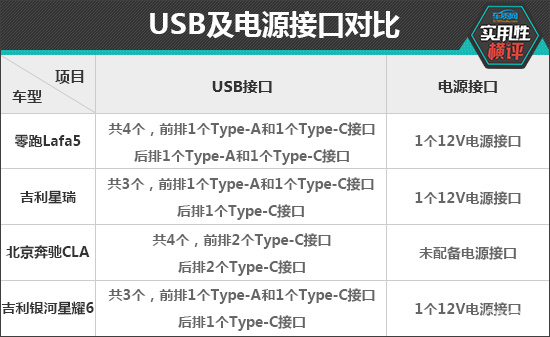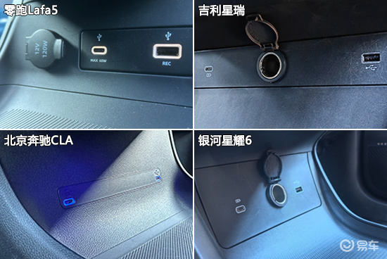 充电接口方面,零跑Lafa5和奔驰CLA全车配备4个USB接口,数量领先于另外两款车型,不过后者仅提供Type-C一种类型,兼容性较差。此外,除奔驰CLA外,另外三款车型均配备1个12V电源接口,可以满足日常用电需求。