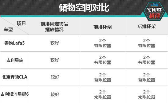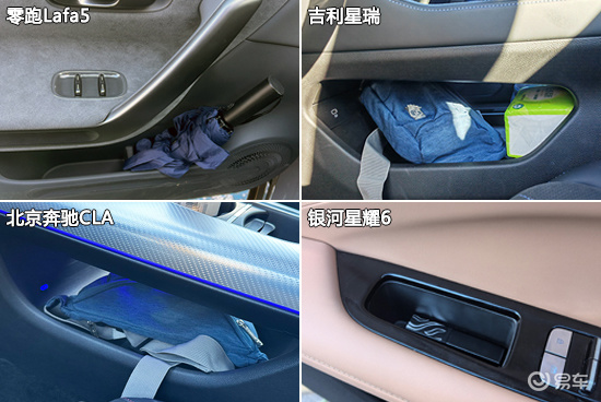 车内储物空间方面,四款车型整体表现基本令人满意,上述固定物品除墨镜外,其余物品都能找到合适的位置进行摆放。